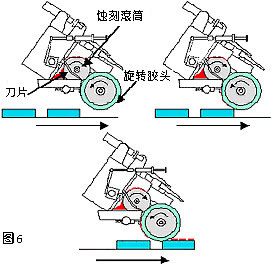 滾印技術(shù)是源于凹版印刷,兩者均普遍使用于圓柱表面或連續(xù)印刷平面物件。這種機(jī)型采用滾動(dòng)式的矽膠頭和滾筒式鋼板,油墨會(huì)從油盤或經(jīng)管道覆蓋圖案,然后刀片再把多余的油墨刮去。當(dāng)滾筒旋轉(zhuǎn)時(shí),膠頭就能從鋼板上取得圖案,然后移到物件上。(圖6)