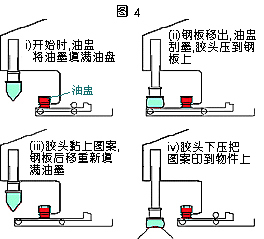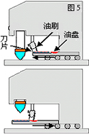 油墨在這機(jī)款中是放置于倒轉(zhuǎn)的密封式油盅里(圖4)。油盅緊貼于鋼板表面,令油墨不會(huì)漏出。同時(shí)間,油盅也有刀片的作用,在鋼板上來回移動(dòng),把油墨留在蝕刻圖案上。這裝置的好處是溶劑的揮發(fā)度可以降至最低。但要留意的是,油盅的價(jià)錢是可以很貴的,所以需要小心地使用。油盅的類型越來越多變,無論在尺寸及設(shè)計(jì)方面,均能切合使用者之需要。