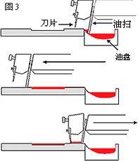 在這個(gè)設(shè)計(jì)中,油墨是放于鋼板后的油盤里(圖3)。印刷時(shí),油墨會(huì)被油掃刮到鋼板上。這時(shí)候,油盤會(huì)被這個(gè)橫移的組件遮蓋,減少溶劑揮發(fā)。油盤實(shí)際上沒有完全被覆蓋,但卻能阻止溶劑揮發(fā)。比較開放式油盤,油墨濃度更穩(wěn)定,作用亦更持久。