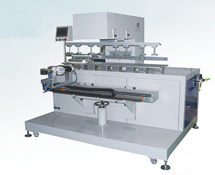 這種移印機是一種設計在輪轉平面上的多色印刷機,由中心的凸輪控制,每小時可達750轉,若印刷四色每小時則可到250件,這種機器適合于中小印量。該機主要由兩個旋轉平臺和中心控制部件組成。一個平臺放置承印物,另一個平臺放印版。這種機器比較適合于主要接外單的公司,因為這些活件印量相對小,又是多色,選用該機型比較劃算。